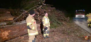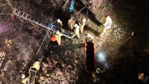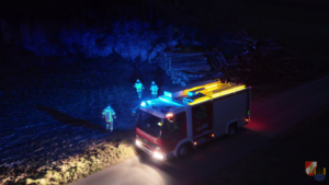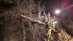 Das TLF war für die Rettung der im Baum hängenden Person zuständig. Diese stellte sich aufgrund der Lage am Abhang als besonders herausfordernd dar. Mittels Leitern, Rettungsleine, Schleifkorbtrage und Rettungswindel gelang es schließlich, die Person sicher aus dem Baum zu bergen.