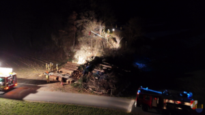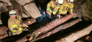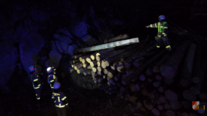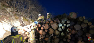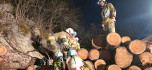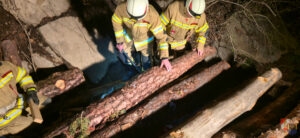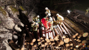 Die Mannschaft des LFB übernahm die Rettung der eingeklemmten Person. Zunächst wurden die Baumstämme entsprechend gesichert, um ein weiteres Abrutschen zu verhindern. Anschließend konnte die verletzte Person mithilfe von Hebekissen angehoben und schonend befreit werden.