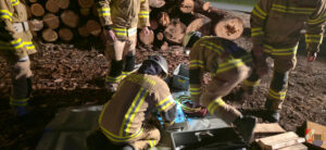 Beim Eintreffen der Einsatzkräfte am Übungsort stellte sich heraus, dass eine Person in einem Baum, der an einem steilen Abhang stand, hängen geblieben war. Die zweite Person wurde unter mehreren Baumstämmen eingeklemmt.